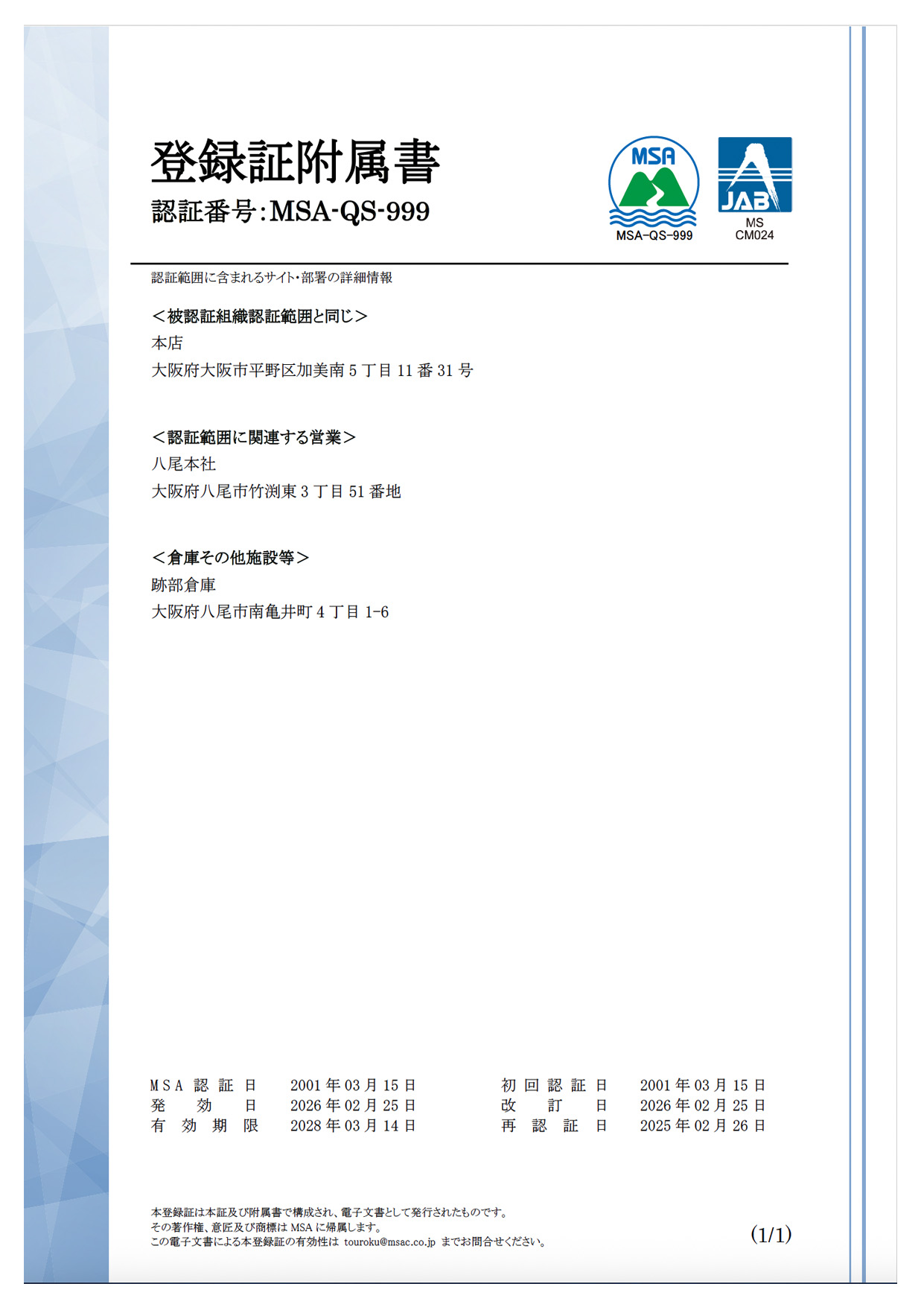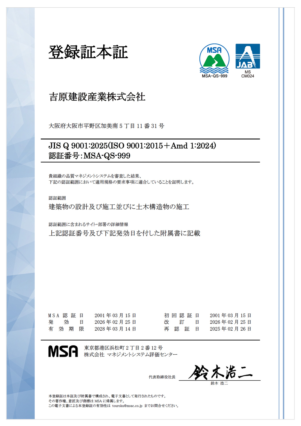組織 :吉原建設産業株式会社 所在地 :大阪市平野区加美南5丁目11番31号 登録番号:MSA-QS-999 登録範囲:建築物の設計及び施工並びに土木構造物の施工 登録に含まれる範囲:八尾市竹渕東3丁目51番(八尾本社) 適応規格:J-Q9001:2015(ISO9001:2015)